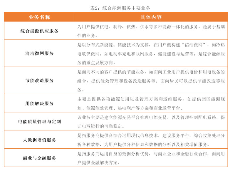 綜合能源服務(wù)的主要業(yè)務(wù)可以進(jìn)一步細(xì)分為:綜合能源供應(yīng)服務(wù)、清潔微網(wǎng)服務(wù)、用能解決服務(wù)、電能質(zhì)量管理與定制、大數(shù)據(jù)增值服務(wù)、商業(yè)與金融服務(wù)。