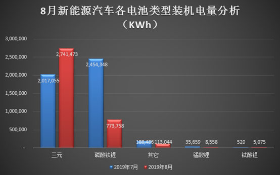 從8月各類(lèi)型電池裝機(jī)量來(lái)看,受新能源乘用車(chē)裝機(jī)量大幅增長(zhǎng)和新能源客車(chē)裝機(jī)電量大幅下滑影響,三元電池和磷酸鐵鋰電池的裝機(jī)情況也和7月相比出現(xiàn)了逆轉(zhuǎn)。