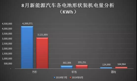從8月各形狀電池裝機(jī)量來(lái)看,方形電池出現(xiàn)明顯環(huán)比下滑,軟包、圓柱環(huán)比裝機(jī)量呈現(xiàn)小幅回升態(tài)勢(shì)。