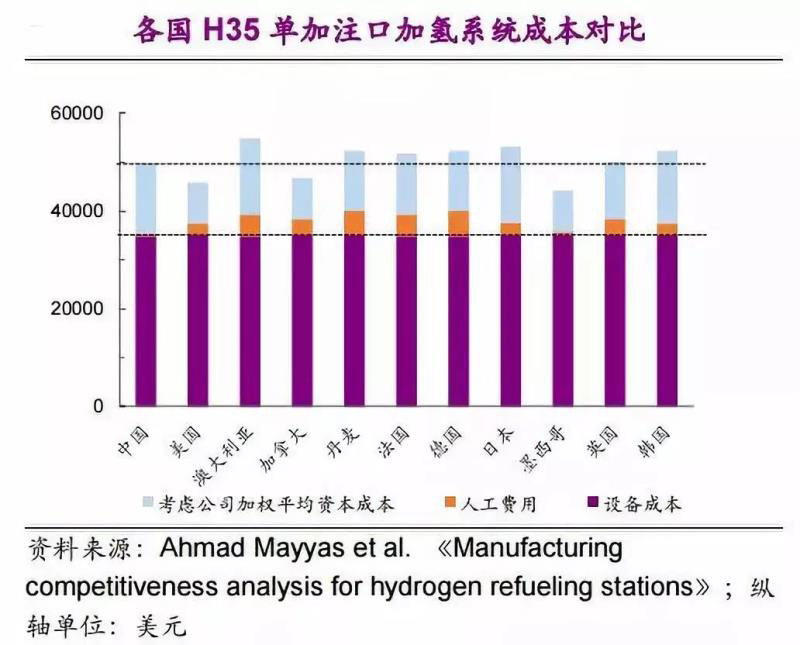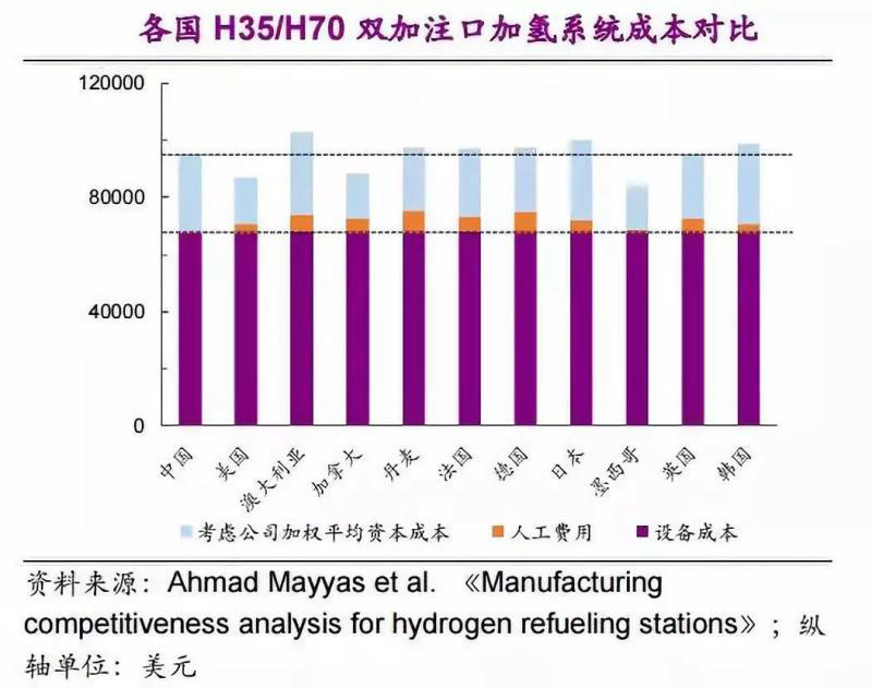 各國(guó)儲(chǔ)氫系統(tǒng)建設(shè)成本比較: