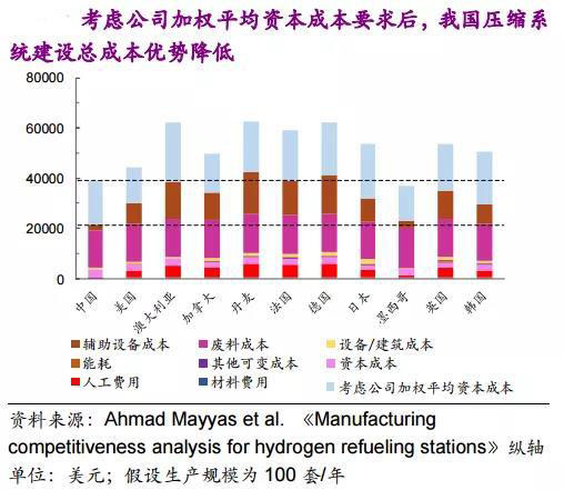 (1)我國(guó)壓縮系統(tǒng)建設(shè)的直接成本和裝配成本在國(guó)際上具有明顯優(yōu)勢(shì),明顯低于美國(guó)、日本、德國(guó)等氫能利用更為廣泛的國(guó)家;