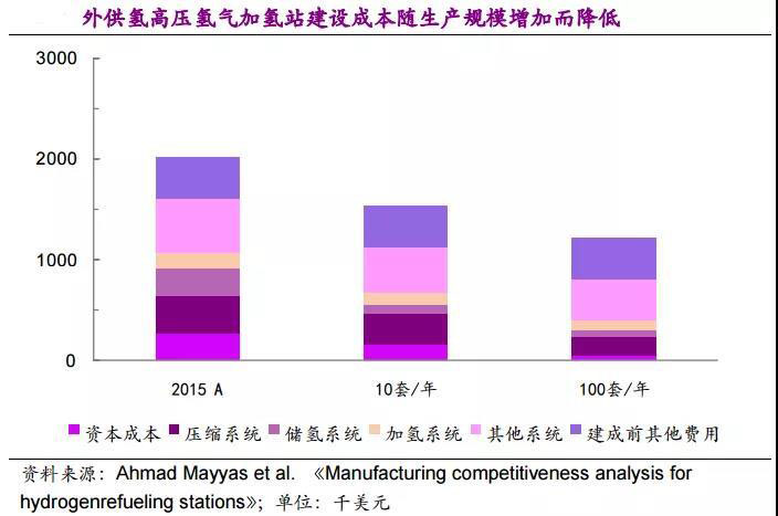 如果生產(chǎn)規(guī)模增加到100套/年,加氫站建設(shè)成本較2015年可降低40%左右。