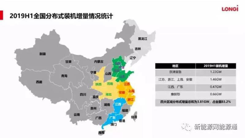 浪潮退去,理智初顯,2019年上半年11.4GW的新增項目中,分布式占4.58GW,同往年一樣,分布式裝機主要集中在京津冀、山東、長三角和廣東地區(qū),而值得注意的是,陜西、河南與湖北也加入了分布式主流市場的行列。