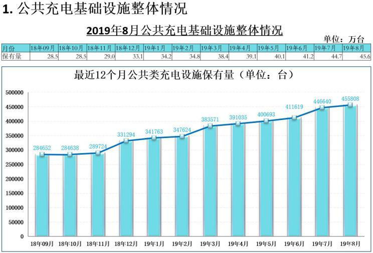 中國儲能網(wǎng)訊:近日,中國電動汽車充電基礎(chǔ)設(shè)施促進(jìn)聯(lián)盟公布了最新國內(nèi)充電樁情況,截至2019年8月,聯(lián)盟內(nèi)成員單位總計上報公共類充電樁45.6萬臺,同比增長63.5%。其中交流充電樁26.5萬臺、直流充電樁19萬臺、交直流一體充電樁549臺。