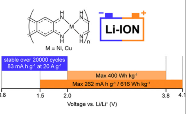 最近,斯科爾科沃科技學(xué)院與俄羅斯化學(xué)物理問(wèn)題研究所的一組由P. Troshin教授領(lǐng)導(dǎo)的科學(xué)家和德國(guó)科隆大學(xué)以及俄羅斯烏拉爾聯(lián)邦大學(xué)合作,專(zhuān)注于研究基于四氨基苯的鎳和銅線性聚合物。雖然該線性聚合物與二維競(jìng)品相比,表現(xiàn)出更低的初始電子導(dǎo)電率,但是能夠作為陽(yáng)極材料,在不到一分鐘的時(shí)間內(nèi)完成充放電,因?yàn)閾诫s了鋰,在第一次放電后,其導(dǎo)電率會(huì)急劇增加。