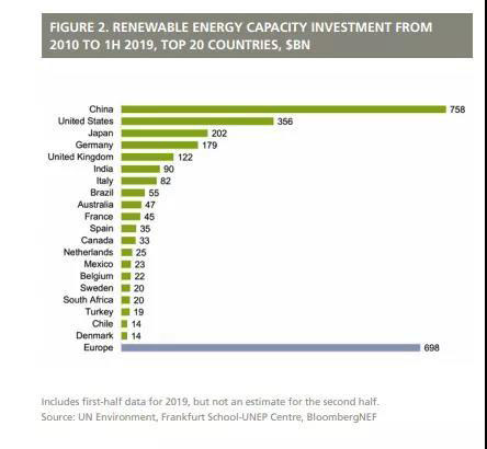 中國在過去10年中一直是可再生能源產(chǎn)能的最大投資國,2010年至2019年上半年以7580億美元的投資額雄踞榜首,美國3560億美元位居第二,日本2020億美元排名第三。