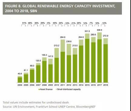 ? 2018年全球可再生能源產(chǎn)能投資達(dá)到2729億美元,是化石燃料發(fā)電投資的3倍。