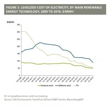 彭博新能源財(cái)經(jīng)(BNEF)首席執(zhí)行官喬恩?摩爾(Jon Moore)評論道:“近年來風(fēng)能和太陽能發(fā)電成本的急劇下降改變了決策者的選擇。這些技術(shù)低碳環(huán)保且建造周期短。目前對許多國家來說,風(fēng)能或太陽能已成為最經(jīng)濟(jì)實(shí)惠的電力來源?!?
