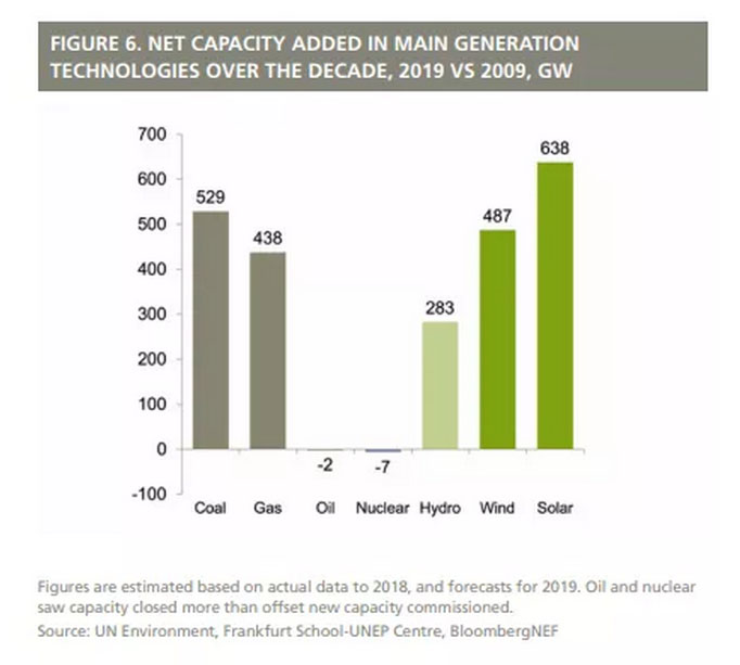 這份名為《2019可再生能源投資全球趨勢》的報(bào)告發(fā)布于聯(lián)合國全球氣候行動(dòng)峰會前夕。報(bào)告指出,可再生能源產(chǎn)能(不包括大型水電)截至今年年底,預(yù)計(jì)將增長至1650吉瓦,相較2009年年底的414吉瓦增長了4倍。