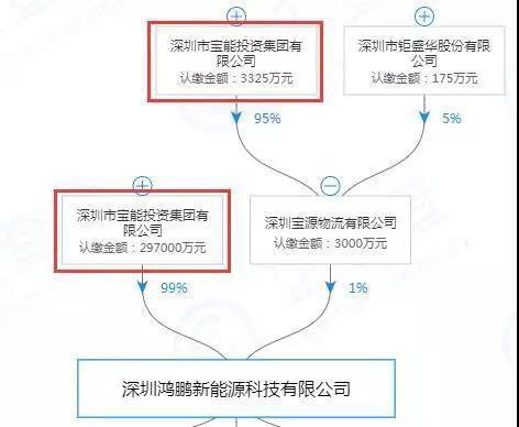 鴻鵬新能源成立于2018年11月,由寶能投資集團(tuán)與寶源物流共同出資建立。其中,寶能集團(tuán)出資29.7億元,占股99%;寶源物流出資3000萬元,占股1%。值得一提的是,寶源物流背后實(shí)際控制人同樣為寶能集團(tuán)(占股95%)。