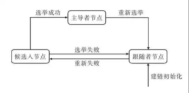RAFT 是一種基于PAXOS 的改進型算法,相較于PAXOS 算法,在具備同等容錯性、傳輸特性的基礎上,架構更簡化,適用于實際的生產環(huán)境[16]。RAFT 主要包含節(jié)點選舉、日志復制兩大重要功能。參與節(jié)點被定義為主導者、跟隨者、候選人3 種狀態(tài)。其中,主導者節(jié)點負責處理系統(tǒng)的服務請求,跟隨者節(jié)點負責被動接收及回復主導者節(jié)點發(fā)送的信息,候選人節(jié)點為在主導節(jié)點發(fā)生故障宕機狀態(tài)下重新進行節(jié)點選舉時的過渡狀態(tài)。