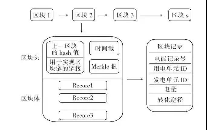 區(qū)塊鏈是一串使用密碼學方法相關聯產生的數據塊,每一個數據塊中都包含一次發(fā)用電的所有相關信息。該類信息不以交易的原始數據形式進行保存,而是利用hash 算法將數據轉化為固定長度的二進制形式的hash 值,并由區(qū)塊鏈系統(tǒng)采用Merkle 樹對這些信息進行歸納表示。當一次電能轉化確實發(fā)生后,區(qū)塊鏈系統(tǒng)還會為其蓋上正確的時間戳,表明該電能量區(qū)塊所屬權已發(fā)生轉移,自動避免重復需求情況的發(fā)生[4,11]。區(qū)塊鏈的該算法流程既可用于驗證其發(fā)用電信息的有效性,同時還可生成下一個區(qū)塊,單個區(qū)塊的數據結構如圖2 所示。