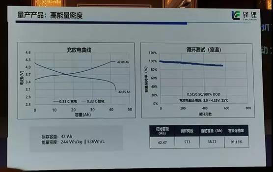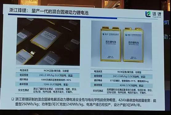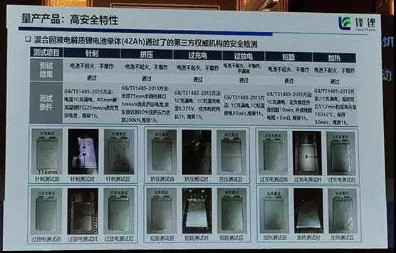 量產(chǎn)一代上,主要是混合固液電解質(zhì)動力鋰電池,林久介紹,鋒鋰基于高鎳三元硅碳負極的混合液態(tài)鋰離子動力電池已經(jīng)達到量產(chǎn)階段,其42Ah單體放電能量密度,能量型可達260wh/kg,功率型(可2C充放)達240wh/kg,并通過了針刺、擠壓、過充、短路、加熱等安全監(jiān)測。