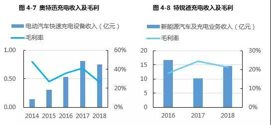 以奧特迅和特銳德2家運營商的充電業(yè)務(wù)經(jīng)營情況為例,2014-2018年我國電動汽車充電樁運營商充電營業(yè)收入呈現(xiàn)出波動上升的局面,這是由于市場競爭大,行業(yè)受宏觀政策影響較大。此外,特銳德毛利率維持在20%左右,而奧特迅毛利率較高,但在2018年兩家公司毛利率均呈現(xiàn)下降趨勢。