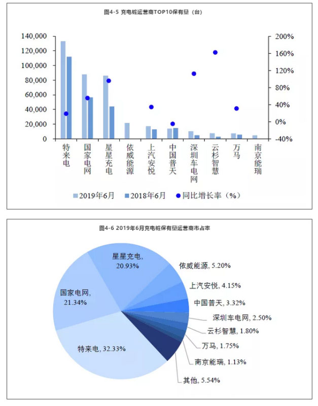 集中度:充電運營環(huán)節(jié)集中度高。截止2019年6月,特來電、國家電網(wǎng)和星星充電分別以13.31萬臺、8.78萬臺和8.62萬臺的保有量位居前三甲,三家市占率之和高達74.6%。