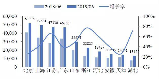 公共樁主要集中在東部沿海地區(qū),截至2019年6月,公共充電樁保有量排名前5的省份為北京、上海、江蘇、廣東、山東。公共充電樁建設(shè)區(qū)域較為集中,前10省份的公共樁占比達75.3%,保有量超過31萬,且普遍分布于直轄市和東部沿海發(fā)達省份,新疆、寧夏和青海等西部省份與吉林省全省僅有數(shù)百個公共樁。從公共充電樁數(shù)量增加速度來看,浙江、湖北、江蘇三省充電樁布局速度快,分別較2018年6月增加9916臺、5610臺、18952臺,增長率位居前三甲,分別為76.8%、71.8%、66.8%。