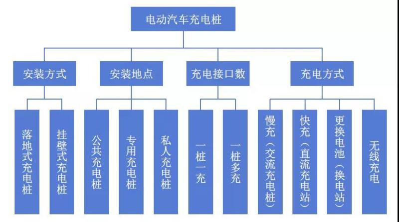 電動汽車充電樁的分類主要有四種方式,以安裝地點分類與充電方式分類最為常見。按照安裝地點可分為公共樁、專用樁、私人樁;按照充電方式的不同可分為:慢充(交流充電)、快充(直流充電)、更換電池(換電)和無線充電。