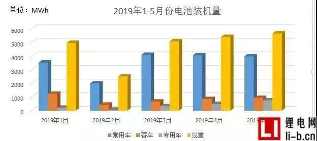 2019年1月份動(dòng)力電池裝機(jī)總量為4977MWh;2月份動(dòng)力電池裝機(jī)總量下降逾一半為2511.1MWh;3月動(dòng)力電池裝機(jī)總量回升與1月裝機(jī)總量相近,為5085.5MWh;4月動(dòng)力電池裝機(jī)總量漲幅較小,為5406.1MWh;5月動(dòng)力電池總裝機(jī)量為5668.4MWh,較上個(gè)月微增。