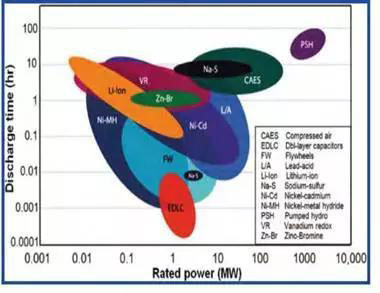 位于圖片右上方的PSH(抽水蓄能)與CAES(壓縮空氣)更符合電網(wǎng)大規(guī)模儲能需求,鋰離子電池可能更適合電動汽車、中小規(guī)模的分布式等更靈活的儲能需求