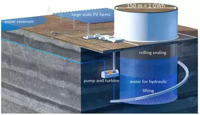 其原理如圖所示:用圓柱體的巖石(像一個活塞一樣)嵌放在形狀相同的儲水池中,有富余電力時(例白天有光伏發(fā)電時),泵會把水壓入儲水池中,此時巖石活塞就會被水壓提起,即電能轉(zhuǎn)化成了重力勢能。而當(dāng)電網(wǎng)需要電能供應(yīng)時(例晚上無光伏發(fā)電時),閘門會打開,此時巖石活塞會下降,擠壓儲水池中的水流經(jīng)泵來發(fā)電,此時重力勢能會轉(zhuǎn)化成電能。