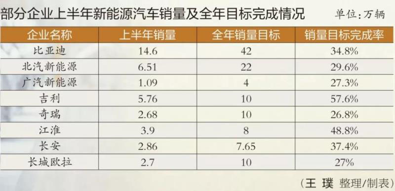 值得注意的是,按照上半年實(shí)際產(chǎn)銷量以及年初中汽協(xié)預(yù)測(cè)的新能源汽車年度160萬(wàn)輛產(chǎn)銷目標(biāo),上半年全行業(yè)新能源汽車銷量目標(biāo)完成率不足40%。記者通過(guò)對(duì)幾家主流新能源車企進(jìn)行梳理發(fā)現(xiàn),上半年銷量目標(biāo)完成率普遍集中在30%~40%之間,其中新能源汽車領(lǐng)頭企業(yè)比亞迪和北汽新能源上半年銷量目標(biāo)完成率分別為34.8%和29.6%,均低于行業(yè)平均水平,廣汽新能源和奇瑞新能源上半年銷量目標(biāo)完成率均處于接近30%的水平。在此次統(tǒng)計(jì)的企業(yè)中,新能源汽車半年銷量目標(biāo)完成率表現(xiàn)相對(duì)較好的是吉利和江淮,分別為57.6%和48.8%。