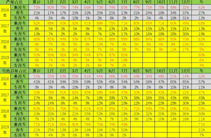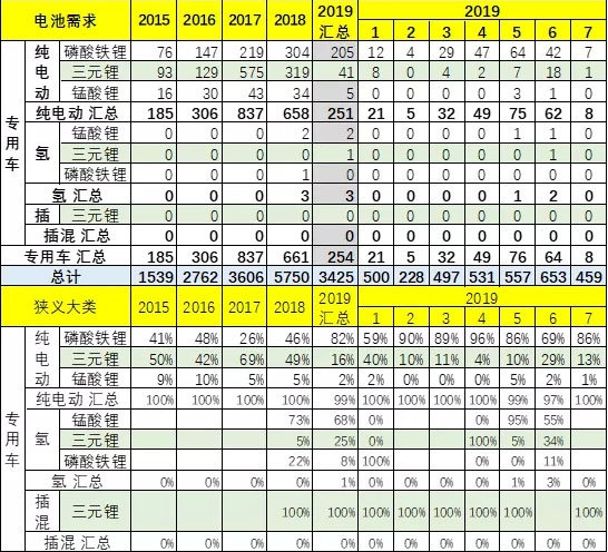 19年的4季度的專用車和客車產(chǎn)量恢復(fù)較好。但相對18年7月的占比提升速度較慢。從產(chǎn)量結(jié)構(gòu)的變化看,19年7月的客車產(chǎn)量占比18%, 7月的客車用電池占比達(dá)到50%。專用車在7月份銷量占比2%,但電池用量占比2%,專用車表現(xiàn)較強(qiáng)。