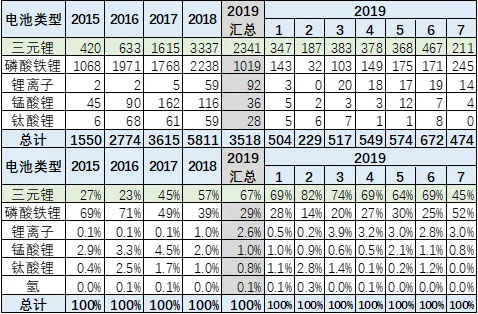 以上數(shù)據(jù)為電池電量的數(shù)據(jù),2017年的電量是3600萬度,18年是5867萬度,其中三元鋰占比在客車銷量高的2季度表現(xiàn)較差19年1-7月是3518萬度,數(shù)量較高。