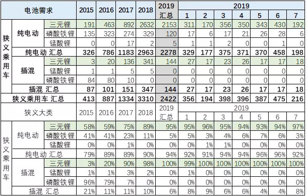此表是狹義乘用車的電池需求特征。近幾年的國產(chǎn)新能源乘用車的產(chǎn)品性能提升很快,其中三元電池的占比提升促進(jìn)乘用車的產(chǎn)品技術(shù)提升。