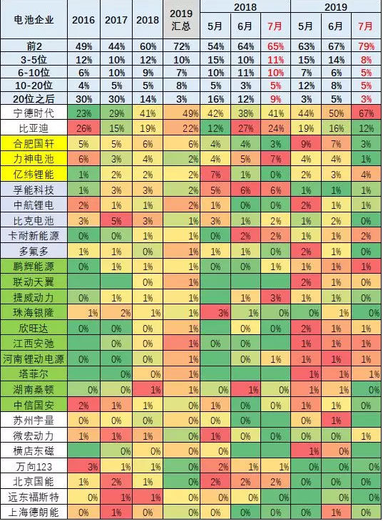 由于前兩位的裝機(jī)增長,3~5位的電池企業(yè)份額相對下降,從2018年1-7月的16%下降到2019年的11%,上升6百分點(diǎn),其他的中間企業(yè)下降幅度目前不大。