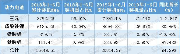 中國儲能網訊:動力電池應用分會研究部統計數據顯示,2019年上半年我國新能源汽車動力電池裝機總量為30014.37MWh,同比增長94.29%。其中,三元電池和磷酸鐵鋰電池仍占據絕對優(yōu)勢,裝機量總和占比高達98.11%,相對于2018年同期的96.95%,上漲超過了一個百分點。