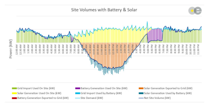 下圖顯示了一個工業(yè)場所部署的一個太陽能發(fā)電設施共址部署的電池儲能系統(tǒng)。電池儲能系統(tǒng)在白天使用太陽能發(fā)電設施多余電力進行充電,然后在當天電價最高的時間放電。運營商可以節(jié)省電費,并減少采用電網(wǎng)的電力,而且電池儲能系統(tǒng)也通過提供固定頻率響應(FFR)服務產生收入。