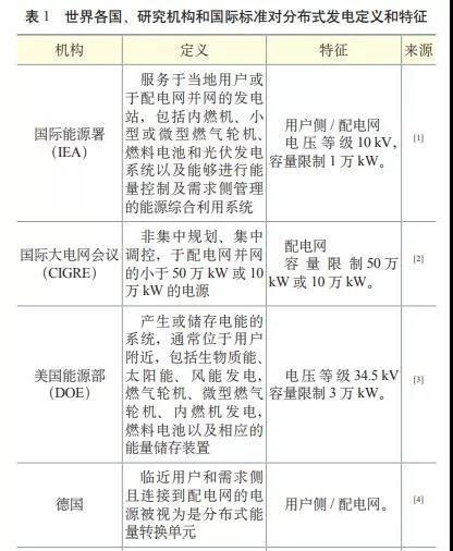 分布式發(fā)電主要指用戶側或配電網(wǎng)側的小型風電、光伏、水電、天然氣發(fā)電等發(fā)電系統(tǒng)。由于不同國家(或地區(qū))分布式電源的發(fā)展背景、發(fā)展階段、電力總需求、電網(wǎng)規(guī)模和電壓等級等均存在差異,因此在對分布式電源的定義方面也不盡相同,見表1。