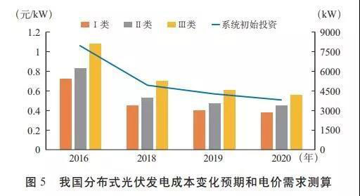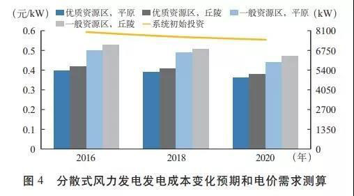 從發(fā)展趨勢來看,受光伏發(fā)電主要部件價格快速下降的影響,預計未來光伏發(fā)電初始投資將大幅下降;人力資源和屋頂資源成本的提升影響將使運行成本保持穩(wěn)定或小幅提升。通過技術創(chuàng)新和智能化應用帶來的風電整體效率的提升,將為分散式風力發(fā)電的成本提供一定下降空間,然而由于人力資源成本和原材料價格等持續(xù)呈現(xiàn)上漲趨勢,分散式風力發(fā)電成本相對穩(wěn)定,下降空間有限。在內部收益率(IRR)為8%時,分散式風力發(fā)電和分布式光伏發(fā)電電價需求測算如圖4所示。