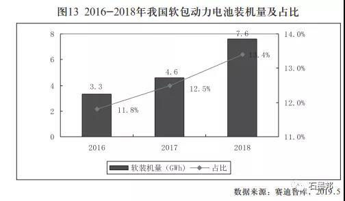 隨著新能源汽車安全性能愈發(fā)受到重視,軟包電池在動(dòng)力電池市 場(chǎng)滲透率穩(wěn)步提升。根據(jù)GBII的統(tǒng)計(jì),2018年我國軟包動(dòng)力電池裝機(jī)量約為7.6GWh,同比增長65.2%, 增速較2017年提高25.8個(gè)百分點(diǎn);軟包電池約占當(dāng)年我國動(dòng)力裝機(jī)量的13.4%,而在2017年、2016年這一數(shù)據(jù)還分別為12.5%和11.8%,2018年軟包動(dòng)力電池占比增幅為 0.9個(gè)百分點(diǎn),增幅較2017年提高 0.2個(gè)百分點(diǎn)。