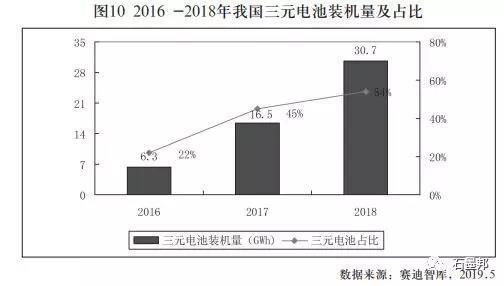2017年以來,我國新能源汽車補(bǔ)貼加大了對(duì)高能量密度動(dòng)力電池的支持力度。三元電池憑借高能量密度優(yōu)勢(shì)快速崛起,強(qiáng)勢(shì)改變動(dòng) 力電池市場(chǎng)格局。2017年三元電池裝機(jī)量達(dá)到了16.5GWh,增幅近10GWh,占動(dòng)力電池裝機(jī)量的比重達(dá)45%,較2016年的22%提高了23個(gè)百分點(diǎn)。2018年,我國動(dòng)力電池裝機(jī)量達(dá)到了57GWh,其中三元電池裝機(jī)量30.7GWh,同比增長91.7%,占動(dòng)力電池裝機(jī)量的比重達(dá)54%,較2017年提高了9個(gè)百分點(diǎn)。隨著三元電池能量密度和安全性不斷提 升,其在動(dòng)力電池市場(chǎng)占比將穩(wěn)步提升。