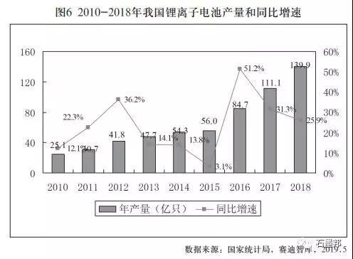 2018年我國新能源汽車產(chǎn)量達(dá)到127萬輛,同比增長了59.9%,增速較上年提高6個(gè)百分點(diǎn),呈現(xiàn)加速增長態(tài)勢(shì)。在此帶動(dòng)下,2018年我國鋰離子電池產(chǎn)量持續(xù)快速增長。國家統(tǒng)計(jì)局?jǐn)?shù)據(jù)顯示,全年我國鋰離子電池累計(jì)產(chǎn)量達(dá)139.9億只,再次創(chuàng)下歷史新高,同比增長25.9%,增速較2017年小幅回落。按容量計(jì)算,2018年我國鋰離子電池產(chǎn)量 124.2GWh,同比增長23.1%。
