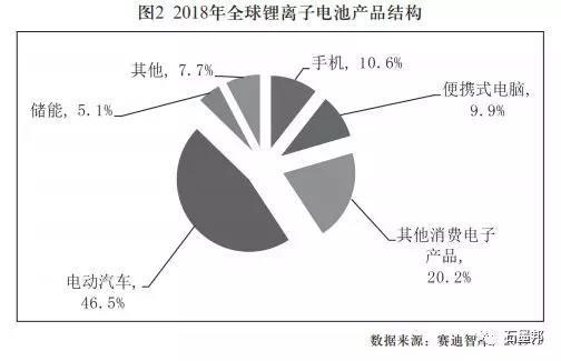按容量計(jì)算,2018年消費(fèi)類鋰離子電池(含手機(jī)、便攜式電腦和其他消費(fèi)電子產(chǎn)品)占比40.7%, 比 2 0 1 7年下降了7.3個(gè)百分點(diǎn);電動(dòng)汽車用鋰離子電池占比達(dá)到46.5%,首次超過消費(fèi)類鋰離子電池,而2017年電動(dòng)汽車用鋰離子電池占比還只有40%;儲(chǔ)能用鋰離子電池占比達(dá)到了5.1%,較2017年增長了0.7個(gè)百分點(diǎn);其他用途(含電動(dòng)工具、電動(dòng)自行車等)鋰離子電池占比為7.7%,基本與2017年持平。電動(dòng)汽車用鋰離子電池已經(jīng)成 為拉動(dòng)全球鋰離子電池產(chǎn)業(yè)增長的主要?jiǎng)恿Γ?018年其對(duì)全球鋰離子電池產(chǎn)業(yè)增長的貢獻(xiàn)率72.5%。