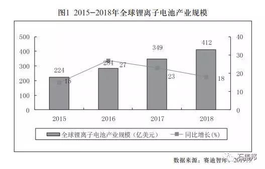 在全球電動(dòng)汽車市場(chǎng)快速增長帶動(dòng)下,全球鋰離子電池繼續(xù)保 持快速增長勢(shì)頭。2018年全球鋰離子電池產(chǎn)業(yè)規(guī)模首次突破400億美元,達(dá)到412億美元,同比增長18%,增速較2017年小幅下滑了5個(gè)百分點(diǎn)。