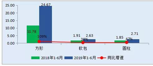 從不同電池形狀來看,2019上半年方形電池裝機電量約24.67GWh,同比增長109%;軟包電池裝機電量約2.63GWh,同比增長38%;圓柱電池裝機電量約2.71GWh,同比增長47%。
