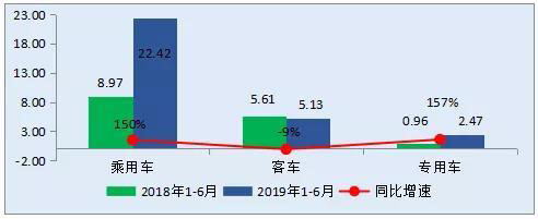 從車輛細(xì)分類別來看,2019上半年新能源乘用車電池裝機電量約22.42GWh,同比增長150%;客車電池裝機電量約5.13GWh,同比下降9%;專用車電池裝機電量約2.47GWh,同比增幅最大,高達(dá)157%。