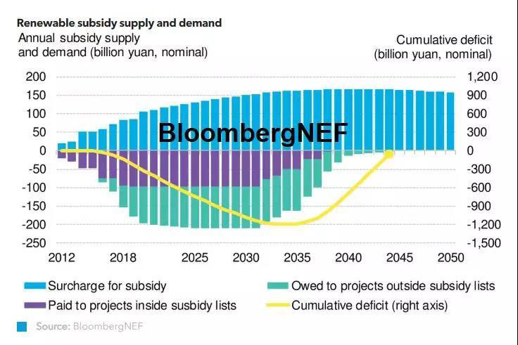 財政部2019年為可再生能源電價附加收入安排的支出預(yù)算為866億元人民幣(126億美元)。雖然這筆支出將有助于填補前七批項目大約三分之二的補貼缺口,但還有176GW左右的新項目仍未進入補貼目錄。BNEF估算,如不采取其他措施,補貼赤字將在未來25年給項目持有企業(yè)持續(xù)帶來壓力。