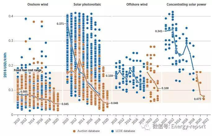 在當今世界大部分地區(qū),可再生能源已成為成本最低的電力來源。隨著太陽能和風能技術成本的持續(xù)下降,更多的國家將會出現(xiàn)這種情況。2010~2018年,生物質(zhì)能、水電、地熱、陸上和海上風電的成本降至化石燃料發(fā)電成本以下,光伏發(fā)電是從2014年開始,全球加權平均電力成本下降到化石燃料發(fā)電成本以下。