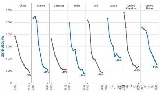 2010~2018年,選定國家的太陽能光伏總安裝成本趨勢