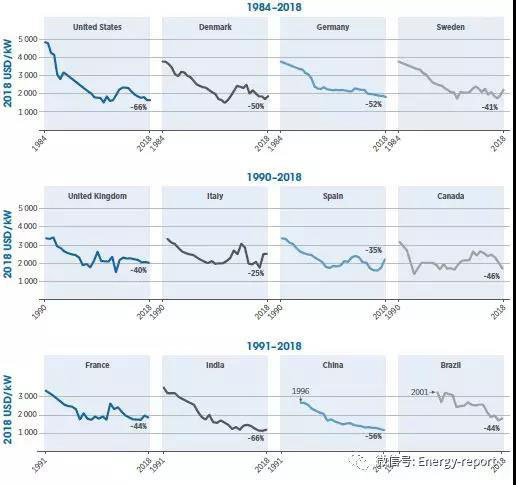 1984~2018年12個國家的陸上風電加權平均安裝成本