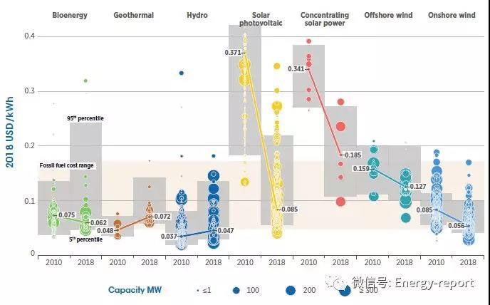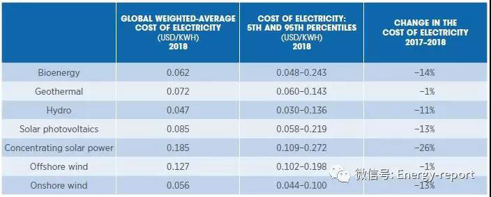 2018年,所有商用可再生能源發(fā)電技術的全球加權平均電力成本下降。2018年,光熱發(fā)電的電力成本同比下降26%,其次是生物質(zhì)能(下降14%)、光伏發(fā)電和陸上風電(均下降13%)、水電(下降11%)、地熱和近海(下降1%)。個人無補貼生物質(zhì)能、水電、陸上風電和光伏發(fā)電削弱化石燃料發(fā)電將越來越普遍。