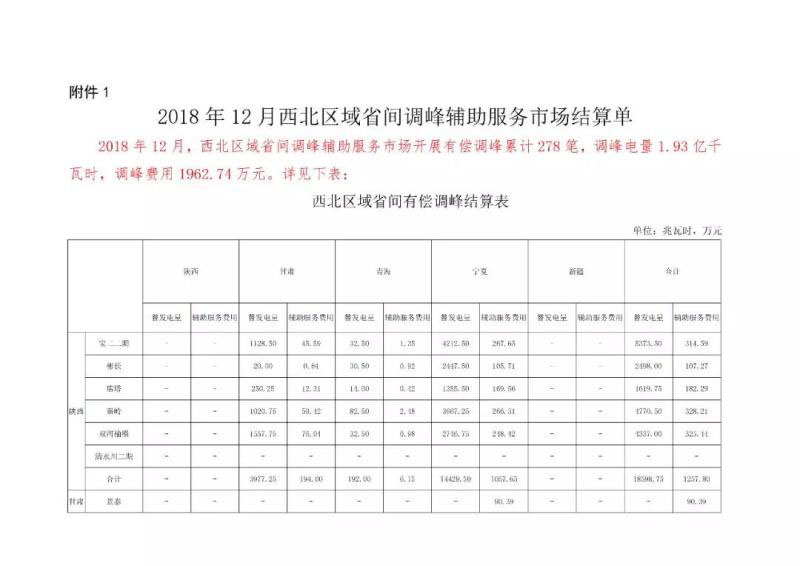 2018年12月,西北區(qū)域省間調(diào)峰輔助服務(wù)市場(chǎng)開(kāi)展有償調(diào)峰累計(jì)278筆,調(diào)峰電量1.93億千瓦時(shí),調(diào)峰費(fèi)用1962.74萬(wàn)元;