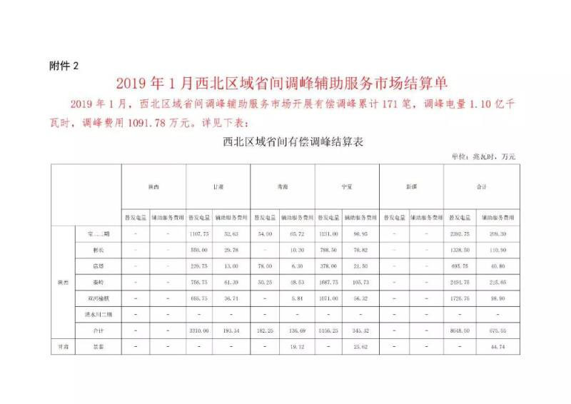 2019年1月,西北區(qū)域省間調(diào)峰輔助服務(wù)市場(chǎng)開(kāi)展有償調(diào)峰累計(jì)171筆,調(diào)峰電量1.10億千瓦時(shí),調(diào)峰費(fèi)用1091.78萬(wàn)元;