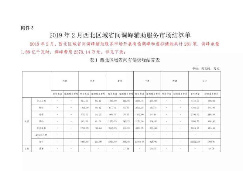 2019年2月,西北區(qū)域省間調(diào)峰輔助服務(wù)市場(chǎng)開(kāi)展有償調(diào)峰和虛擬儲(chǔ)能共計(jì)281筆,調(diào)峰電量1.88億千瓦時(shí),調(diào)峰費(fèi)用2378.14萬(wàn)元;