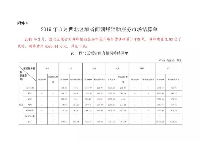 2019年3月,西北區(qū)域省間調(diào)峰輔助服務(wù)市場(chǎng)開(kāi)展有償調(diào)峰累計(jì)479筆,調(diào)峰電量3.03億千瓦時(shí),調(diào)峰費(fèi)用4520.44萬(wàn)元。