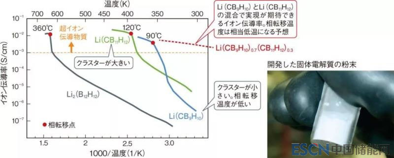 但是,它仍然高達(dá)90°C。金教授試圖以是與LiCB11H12和LiCB9H10混合固溶體提高不規(guī)則性降低相變溫度。結(jié)果,至少20℃以上不會(huì)發(fā)生相變,Li離子高傳導(dǎo)性的狀態(tài)被維持在一個(gè)寬的溫度范圍內(nèi)。鋰離子的傳導(dǎo)性在25℃時(shí)為6.7×10-3 S/cm,110℃時(shí)為和8.5×10-2 S/cm,相當(dāng)于硫化物基的材料。 “在我們目前的分析中,我們期望在相當(dāng)一個(gè)可以考慮的低溫度范圍內(nèi)不會(huì)相變,”金教授說。